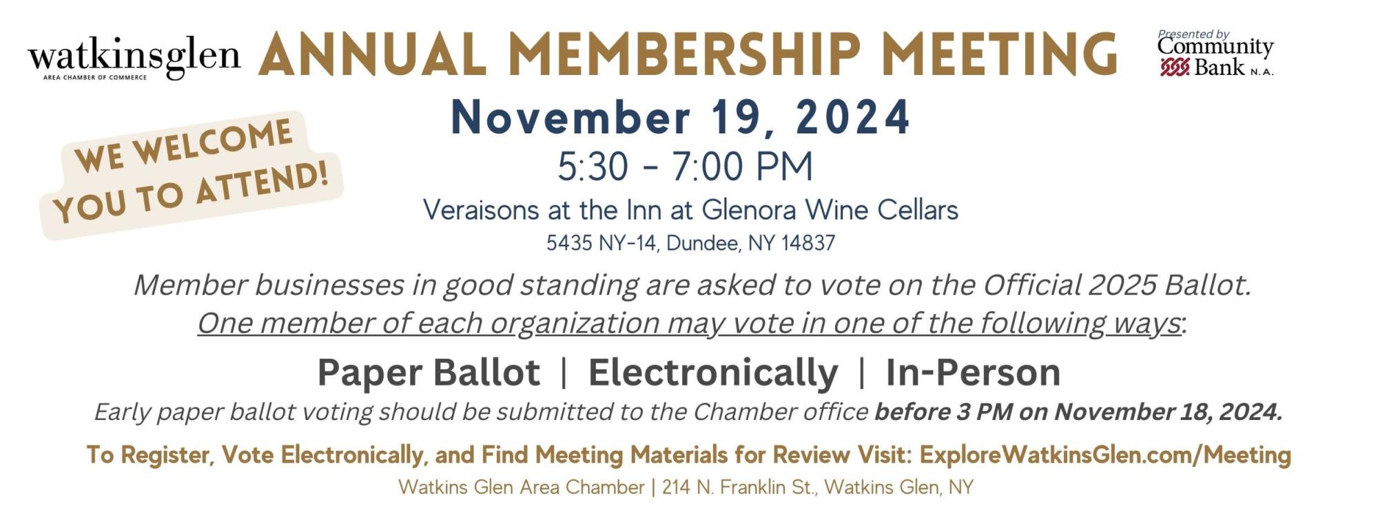To Vote Electronically, Review the 2025 Budget & 2023 Annual Meeting Minutes visit https://www.explorewatkinsglen.com/meeting/