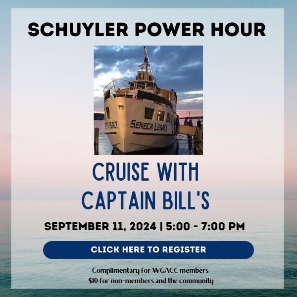 Join us on September 11th at Captain Bill's to experience their special Seneca Lake cruise while making some new connections! The cruise will depart from the Seneca Harbor Station boat launching dock. Upon departure, guests will enjoy an assortment of appetizers, a cash bar, and live music entertainment by Harry Havery. Seats are limited, so make sure to sign up early!