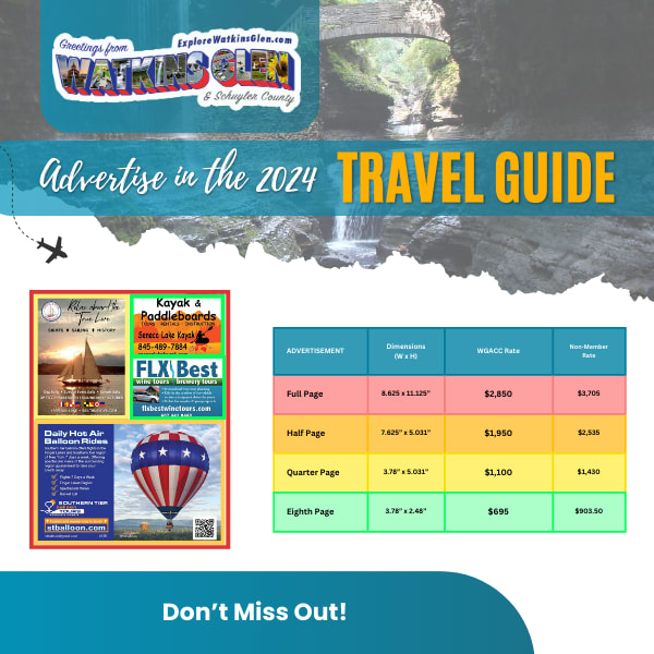 Looking to capture prime attention in the trip planning process? Secure your spot in the 2024 Travel Guide! With 100,000 copies slated for distribution across New York State's key hubs—including visitor centers, lodging spots, airports, festivals, and attractions—your advertisement is poised to reach eager travelers at every turn. Plus, Chamber members enjoy a discounted price, ensuring an even greater return on investment for your advertising efforts. Don't miss out on this opportunity to make your mark before and during their journey.